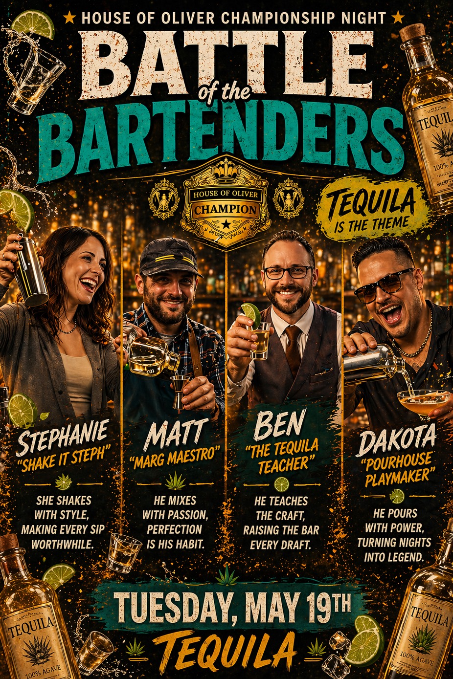 Time to Party Cinco de DRINCO style at House of Oliver FREE Tequila Tasting Margarita specials Drink Specials Street Tacos & Food Specials LIVE MUSIC 6-9pm Perfect Patio - and tons of FUN RSVP HERE